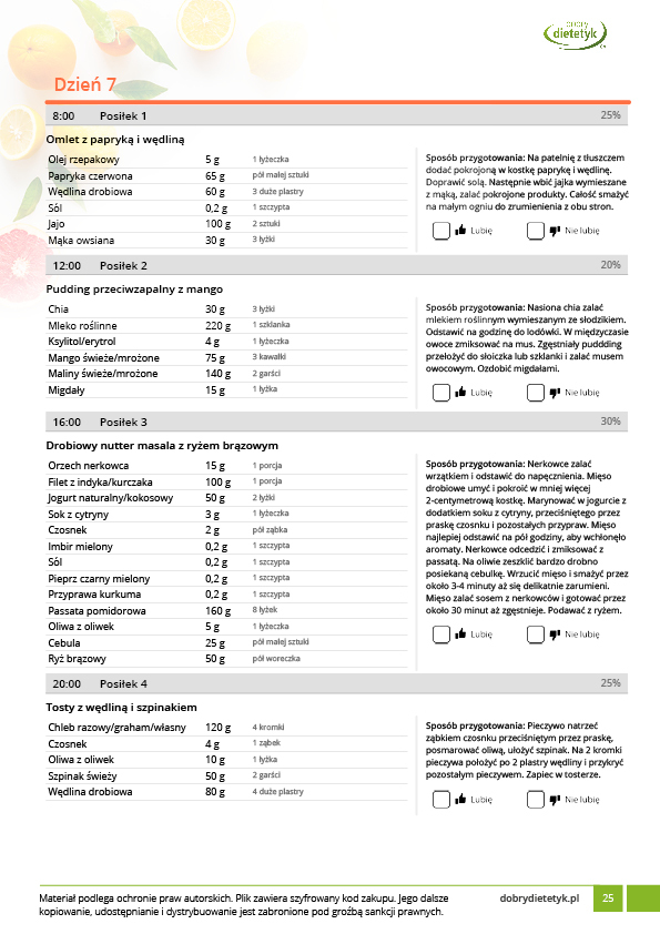 • w formie propozycji posiłków (zamiast pojedynczych jadłospisów jednodniowych, przygotowano propozycje kilku propozycji dań na każdy posiłek). Tutaj nie uzależniamy Cię od tego jakie masz np. w danym dniu zjeść śniadanie czy obiad, tylko sam wybierasz sobie ulubione danie z kilku przedstawionych przez nas propozycji.