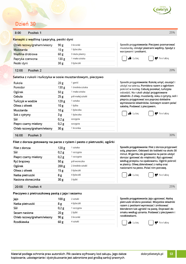 • w formie precyzyjnych jadłospisów wielodniowych (na każdy dzień miesiąca jest opracowany osobny jadłospis). Tutaj nie musisz zastanawiać się co zjeść każdego dnia, gdyż będziesz mieć dokładnie wszystko rozplanowane.